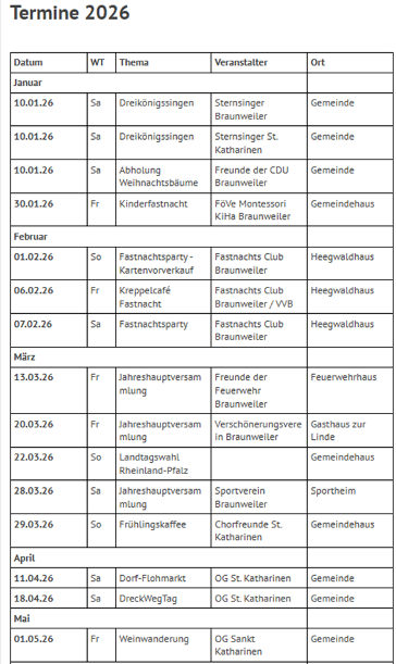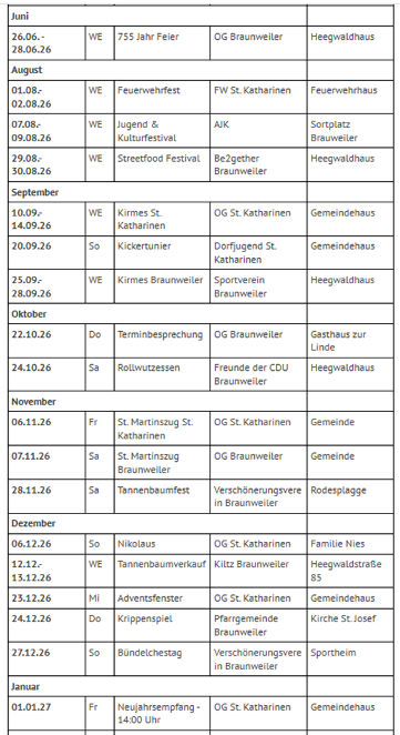 HWH - Heegwaldhaus FWG - Freie Wählergemeinschaft SVB - Sportverein Braunweiler MVB - Musikverein Braunweiler VVB - Verschönerungsverein Braunweiler FCB - Faschingsclub Braunweiler FdFW - Freunde der Feuerwehr |